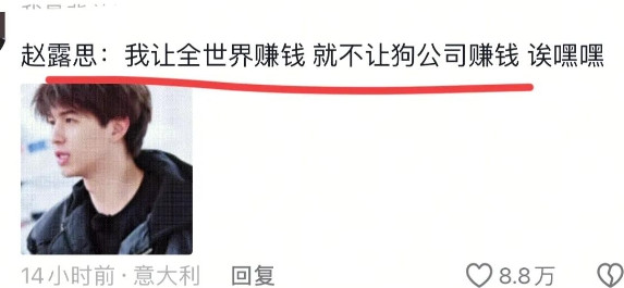 好在赵露思本人的态度很坚定,既然公司不给工作,那我就天天在家直播。 既能保留自己的热度,还能恶心公司,最近更是因为助农行为口碑暴增,估计公司要呕死了。