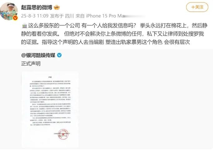 估计银河酷娱也要气炸肺了,明明手握合约,却对赵露思一点办法都没有。 不怪赵露思和公司硬刚,看看公司之前的一些做法,实在挺没人性的。 2023年赵露思的爸爸患癌,爷爷离世,公司竟然全部不准假,还说“谁家能没点事啊”。