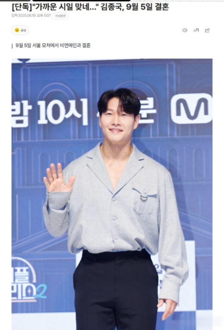 最后,据演艺相关人士消息,金钟国将于9月5日在首尔某处与非艺人女友举办婚礼,婚礼将小规模进行,有家人和亲近的朋友参加,也将邀请在同一节目中活跃的同事们。
