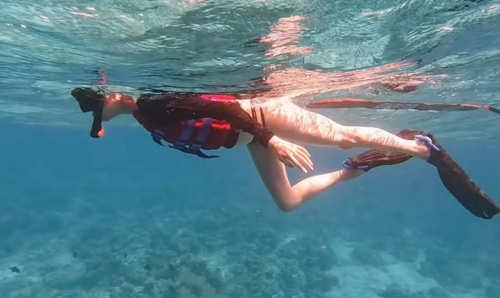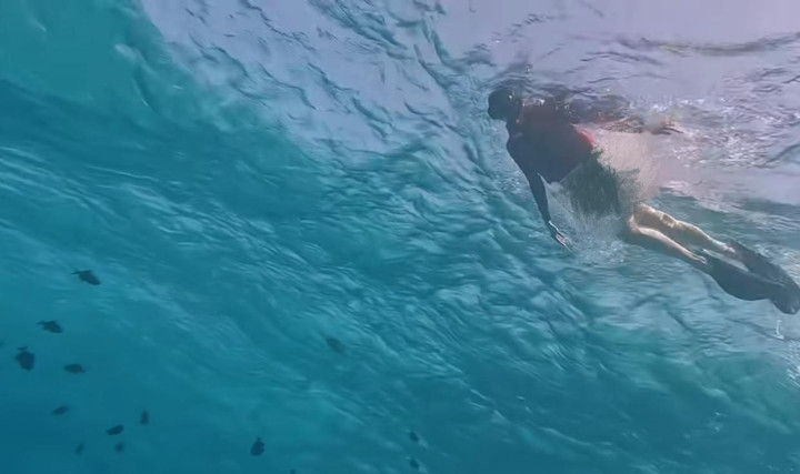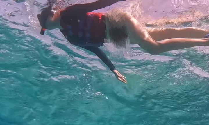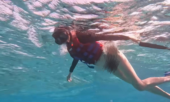 关晓彤在当地工作人员的陪同下体验潜水,她装备齐全安全下潜,在水中畅游很是惬意。 马尔代夫的海水特别透彻,阳光直接穿透海水到达底部,朵朵珊瑚如花朵一样在海底绽放,关晓彤在距离水面的地方从上往下欣赏,所有美色全部都收入眼中。