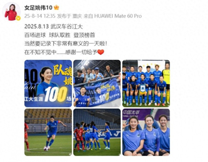直播吧8月14日讯 女超联赛第16轮,武汉车谷江大女足客场2-0击败永川茶山竹海橙狮女足。此役,中国女足国脚姚伟完成其在武汉车谷江大生涯第100场女超联赛,并攻入一球。赛后,姚伟更新了社交媒体。 姚伟社交媒体内容如下 2025.8.13 武汉车谷江大 百场进球 球队取胜 登顶榜首 当然要记录下非常有意义的一天啦! 在不知不觉中……感谢一切给予 本赛季,姚伟代表武汉女足出战11场,其中10次首发,贡献了1个进球。 |
