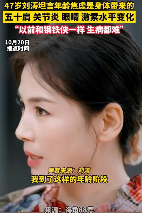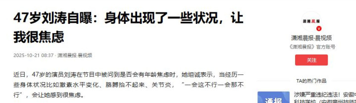 毕竟身体是自己的,只有身体好了,才能好好享受生活里的那些美好。 [免责声明]文章描述过程、图片都来源于网络,此文章旨在倡导社会正能量,无低俗等不良引导。如涉及版权或者人物侵权问题,请及时联系我们,我们将第一时间删除内容!如有事件存疑部分,联系后即刻删除或作出更改 信源: 1. 47岁刘涛自曝:身体出现了一些状况,让我很焦虑 2025-10-21 潇湘晨报·晨视频