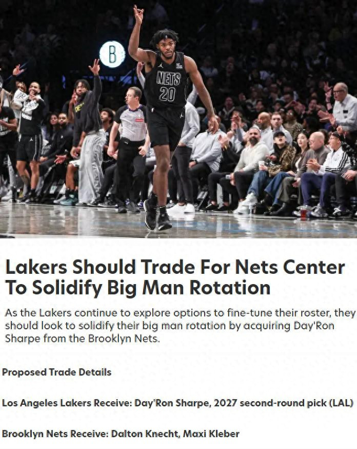 美媒《Fadeaway World》建议湖人、篮网做一笔2换2交易。具体为湖人送出克内克特、克勒贝尔得到夏普和自己27年次轮。 事实上,仅就对比海斯,我认为夏普是更适合湖人的第二中锋。 即战力 24-25季即便夏普全部以替补出场但场均的8+7还是优于首发35场海斯的7+5。事实上,生涯至今夏普的场均7+6也要优于海斯的7+4。也就是说,夏普即战力要优于海斯。