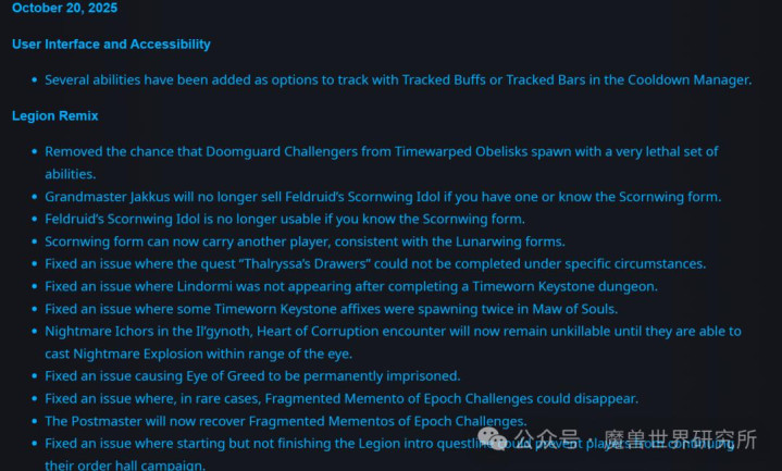 用户界面与易用性 冷却管理器已新增多项技能,可通过追踪增益效果或追踪状态栏功能进行监控。 军团再临:幻境新生 移除了时空扭曲方尖碑召唤出的末日守卫挑战者携带极高致命性技能组合的可能性。 若你已拥有邪能德鲁伊的蔑翼神像或已掌握蔑翼形态,大宗师加库斯将不再出售该神像。 若你已掌握蔑翼形态,则无法再使用邪能德鲁伊的蔑翼神像。 蔑翼形态现在可携带另一名玩家,与月翼形态保持一致。 修正了“塔莉萨的抽屉”任务在特定情况下无法完成的问题。 修正了完成弥时钥石地下城后,林多尔米未出现的问题。 修正了噬魂之喉副本中部分弥时钥石词缀会重复生成的问题。 在伊格诺斯,腐蚀之心战斗中,除非梦魇脓液的梦魇爆破能够对眼球造成伤害,否则将始终处于无法被击杀的状态。 修正了贪婪之眼被永久禁锢的问题。 修正了粉碎的纪元挑战纪念品在极少数情况下可能会消失的问题。 邮政长现在可找回粉碎的纪元挑战纪念品。 修正了开启但未完成军团再临序章任务线,可能导致玩家无法继续职业大厅战役的问题。 |