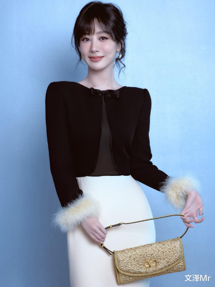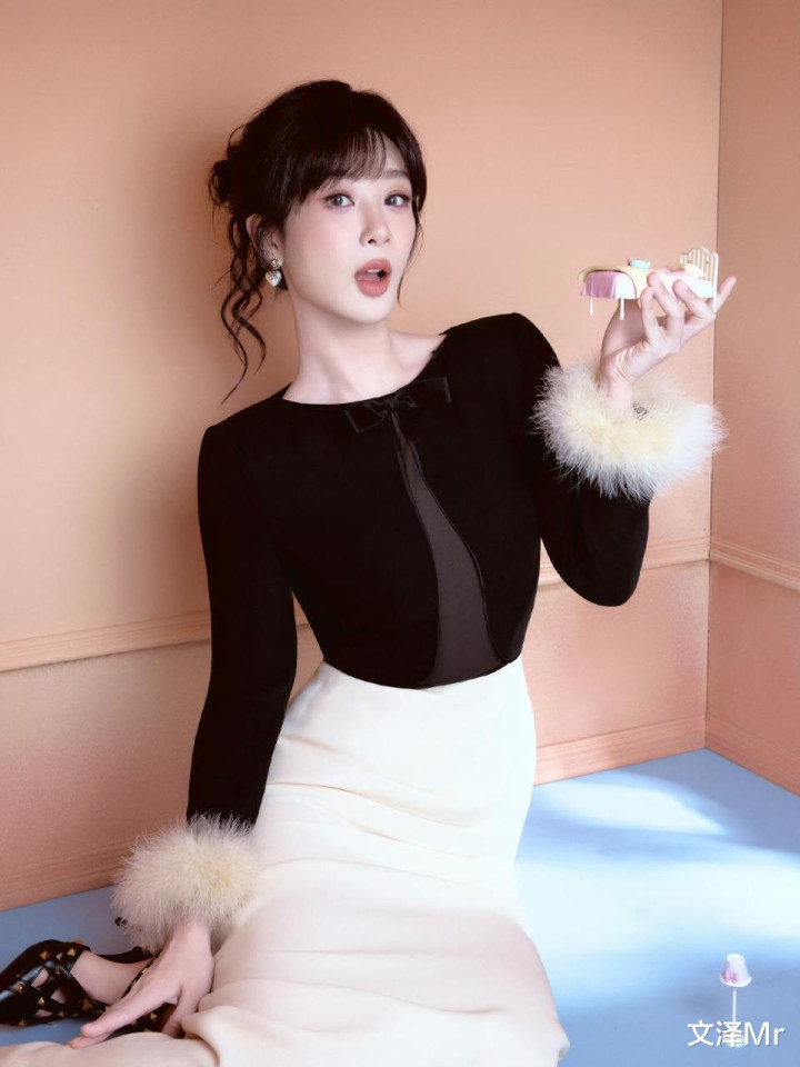 黑色蝴蝶结上衣与米白长裙的碰撞,瞬间将法式浪漫拉满!齐刘海短发下的杨紫眼眸含笑,蓬松毛绒袖口增添灵动感。她随意倚靠窗边,手举白色小物件的姿态看似随性,实则暗藏巧思——金色手提包与地上的迷你沙发、小床模型,仿佛在诉说一个童话般的微型剧场。这组造型完美诠释了她“甜而不腻”的气质。