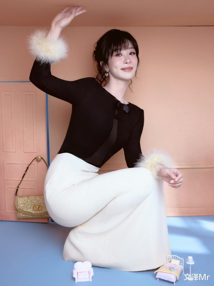 盘发凸显精致锁骨,黑色毛绒袖上衣与白色阔腿裤的搭配利落干练。单膝跪地的杨紫抬手轻触发梢,既有少女的羞涩又不失大气。背景中浅粉色的门与右下角的迷你家具呼应,让画面像一场沉浸式家居美学展。这套穿搭恰好用宽松裤装藏肉显瘦,堪称梨形身材范本!